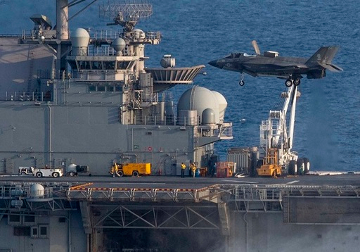 미 해군은 아메리카호의 비행갑판 위로 최신 스텔스 전투기 F-35B가 착륙하는 사진을 게재했다. 우리 공군도 보유한 F-35A를 해병대용으로 개조한 F-35B는 스텔스 성능과 별개로 수직이착륙 기능을 갖추고 있다. 비행갑판이 좀 좁아도 그 위에서 뜨고 내리는 데 문제가 없다는 뜻이다. 따라서 F-35B 전투기 수십대를 싣고 다니는 강습상륙함은 사실상 항공모함이나 마찬가지란 게 군사 전문가들의 설명이다.