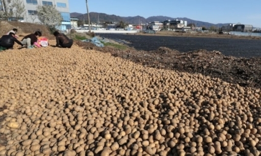 한 주민은 “여기 감자를 쏟아놓고 떠난 농민의 심정이 얼마나 참담했을지 짐작이 간다”고 말하면서도 바쁜 손길로 감자를 담았다.