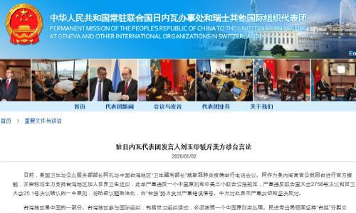 류위인(劉玉印) 주 제네바 중국대표부 대변인은 대표부 홈페이지에 '대만 지구'는 중국의 일부분으로 WHO 활동 등 국제조직의 참여는 반드시 '하나의 중국' 원칙에 따라 처리되어야 한다고 밝혔다.