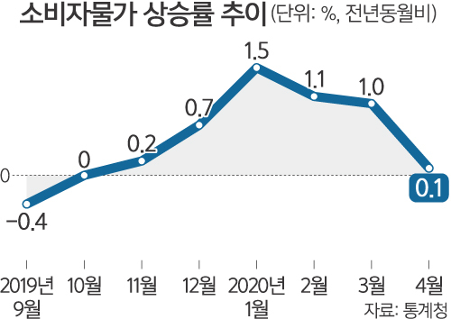코로나19의 영향과 국제유가 급락 등으로 지난달 소비자물가 상승률이 0.1%에 그치며 6개월 만에 최저치를 기록했다. 올해 들어 지난 3월까지 이어지던 1%대 행진도 중단됐다. 그러나 코로나19 방역이 성공하면서 생필품 사재기 현상을 빚은 다른 나라에 비해 상대적으로 소비자물가 상승률이 낮았다.