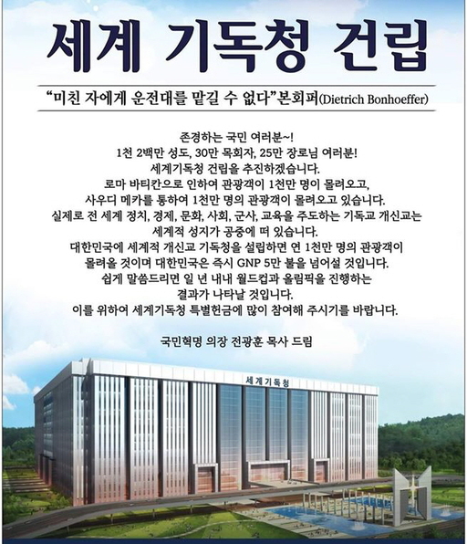전 목사는 “가톨릭은 바티칸, 이슬람은 메카라는 중심이 있지만 기독교는 없다며 세계기독청을 건립해야 한다”고 주장했다. 그러면서 “세계기독청이 들어서면 연간 1000만명 이상의 관광객이 몰려드는 등 국가경제에도 큰 도움이 될 것이라며 특별헌금에 동참해 달라”고 했다.