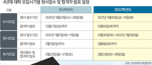 입시 관련 기사를 보면 ‘올해 수시 77%, 정시 23%’, ‘2022학년도 이후 정시모집 30% 이상 확대’ 등 ‘수시’ ‘정시’란 단어를 쉽게 찾을 수 있다. 대입에서는 각 모집 시기에 따라 수시모집, 정시모집, 추가모집 3번의 모집시기를 가진다.
