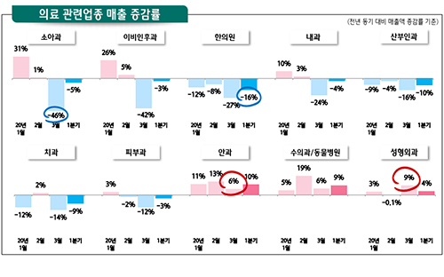 보고서에 따르면 3월 들어 의료 관련 업종에서 소아과(-46%), 이비인후과(-42%), 한의원(-27%) 등 대부분 병의원의 매출이 전년 동월대비 급감했다. 반면 성형외과(+9%)와 안과(+6%) 매출은 증가했다.