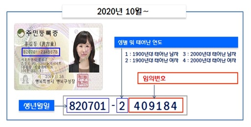 개정안에 따르면 오는 10월부터 출생과 귀화 등으로 주민등록번호를 새로 부여받거나 변경하는 경우 생년월일 다음 뒷자리는 성별 표시 첫 자리를 제외하고는 6자리의 임의번호를 부여받게 된다. 1975년 현행 주민등록번호 부여 체계 도입 이후 45년 만의 개편이다.