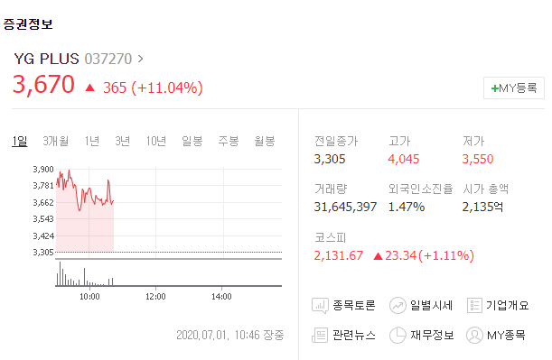 YG PLUS는 1일 오전 10시 57분 기준으로 코스피 시장에서 전 거래일보다 11.04%(365원) 상승한 3670원에 거래되고 있다.