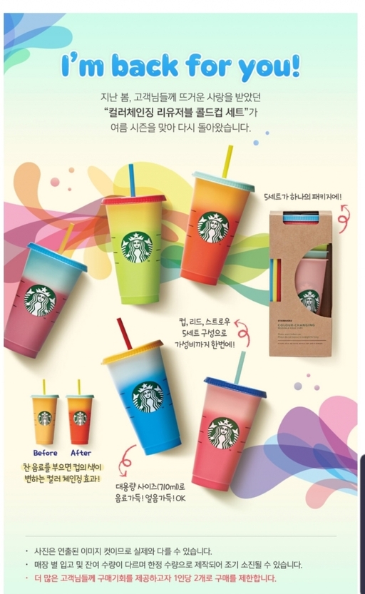 리유저블 콜드컵은 컵과 리드, 스트로우가 5개씩 들어있는 세트 구성으로 판매된다. 차가운 음료를 부으면 컵의 색깔이 변하는 것이 특징이다. 지난 3월 출시해 조기 품절됐다가 이번에 재출시됐다.
