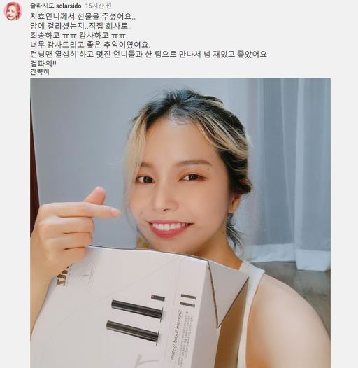 사진 속 솔라는 손가락으로 하트 모양을 하며 송지효의 선물을 자랑하고 있다.