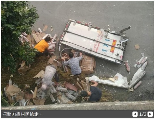 중국의 한 마을 주민들이 화물트럭 전복사고 현장에 쏟아진 냉동 돼지고기를 다량으로 훔쳐 간 황당한 일이 발생했다.