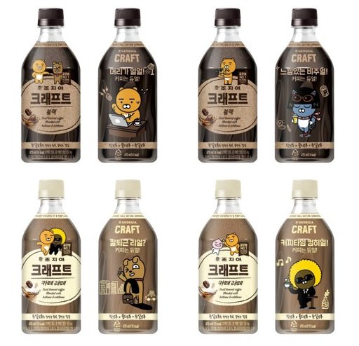 먼저 ‘조지아 크래프트 블랙’ 패키지에는 “머리가 얼얼! 커피는 듀얼!”, “느낌있는 비주얼! 커피는 듀얼!” 등 듀얼 브루를 강조하는 문구를 삽입했다. 땀 흘리며 열심히 근무하는 라이언과 커피를 즐기며 도도하게 걷는 네오 캐릭터를 함께 디자인해 상황의 재미를 살렸다. ‘조지아 크래프트 카페라떼’ 패키지에는 “칼퇴근 리얼?”이라는 문구 아래 퇴근하는 프로도, “커피타임 컴히얼!”이라는 문구 아래 여유롭게 커피를 즐기는 제이지가 등장한다.