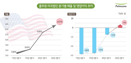 풀무원USA의 최근 네 분기 매출과 영업이익 추이를 보면 지속적인 외형성장과 수익구조 개선이 동시에 이뤄지고 있는 모습을 확인할 수 있다. 19년 3분기 풀무원USA는 매출 548억 원에 영업이익은 -58억 원으로 적자를 기록했다. 반면 올해 2분기 매출은 작년 3분기 대비 약 20% 성장한 657억 원을 기록했고, 영업적자를 완전히 해소하며 영업이익 7억 원으로 흑자 전환했다.