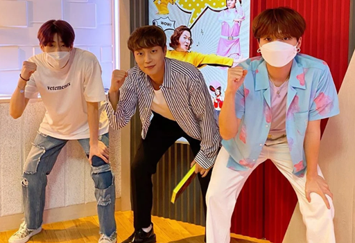 글 밑에는 윤두준이 게스트로 나온 가수 정세운, 그룹 빅톤의 한승우와 함께 축구선수들이 할 법한 포즈로 찍은 사진이 올라왔다.