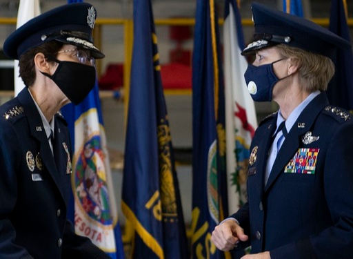미 공군 공중기동사령부 사령관 이·취임식에서 신임 사령관 재클린 반 오보스트 대장(왼쪽)이 퇴역하는 전임 사령관 매리앤 밀러 대장과 대화하고 있다. 미 공군 홈페이지
