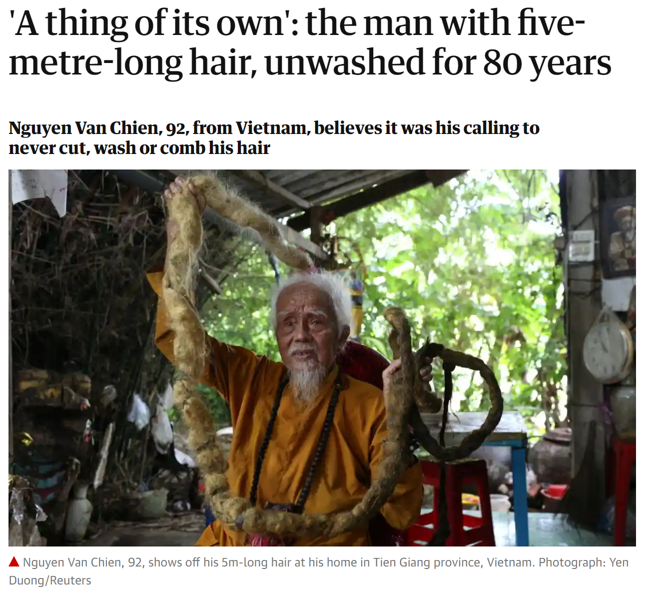 지난 25일(현지시간) 영국 ‘가디언’ 등 외신은 “베트남 남부 메콩 지역에 사는 응우옌 반 찌엔(92)은 80년 넘게 머리를 깎지도, 빗지도, 감지도 않았다. 머리카락 길이는 5m에 달한다”고 보도했다.