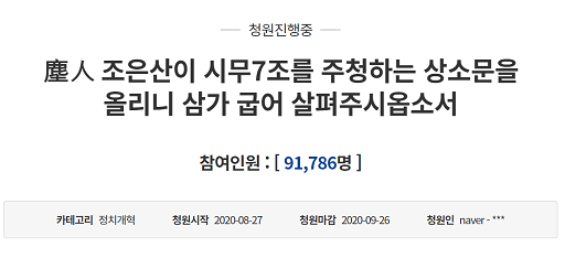 한편, ‘시무7조’ 청원은 3개가 더 있었던 것으로 알려졌지만 27일 오후 4시 30분경 하나만이 공개돼있는 상태다. 해당 청원은 9만1786명의 인원이 참여했다.