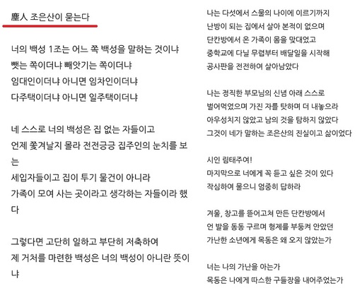 임금께 올리는 상소문의 형식을 빌려 청와대 국민청원글을 게재했던 ‘진인 조은산’이 자신의 글을 향한 림태주 시인의 지적에 “너의 글을 깨뜨릴 것이니 노여워 말고 새겨 들어라”며 답신을 보냈다.
