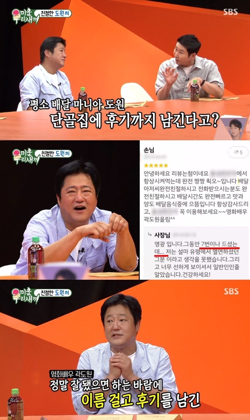 이날 방송에서 MC 방송인 신동엽(맨 위 사진 오른쪽)은 “(곽도원이) 배달 음식을 직접 시켜 먹고 단골집에 후기까지 남긴다더라”고 말문을 열었다.