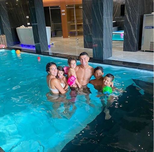 사진 속 호날두는 스페인 출신 연인 조지나 로드리게스(사진 맨 왼쪽)와 함께 네 명의 아이들과 수영장에서 물놀이하며 즐거운 한 때를 만끽하고 있다.
