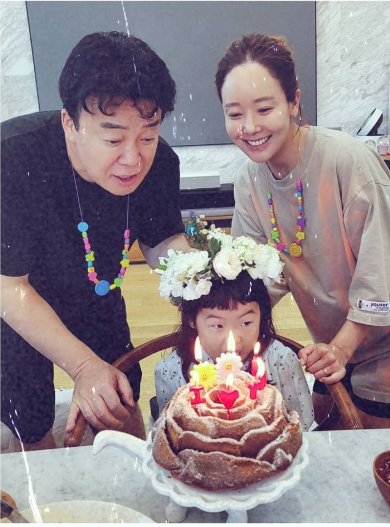 요리 연구가이자 외식 사업가인 백종원 더본코리아 대표(아래 사진 오른쪽)의 부인인 배우 소유진(〃 〃 왼쪽)이 큰딸 서현양(위 사진 앞줄)의 5번째 생일 소식을 알렸다.