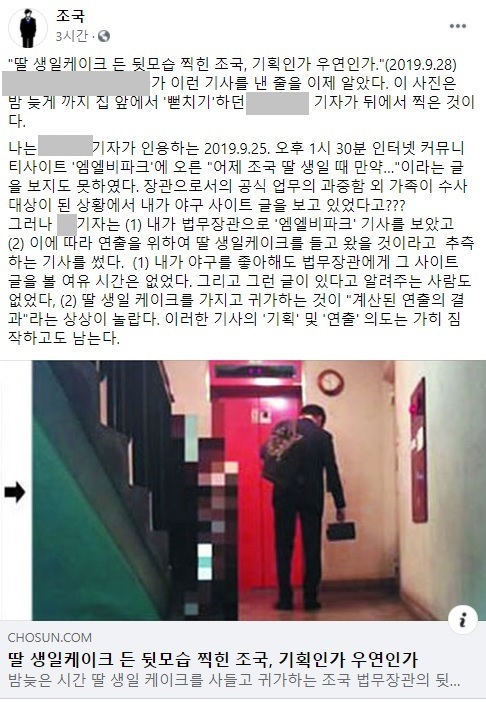 조 전 장관이 언급한 기사는 지난해 9월28일자 보도로, 당시 딸의 생일을 축하하기 위해 케이크를 들고 귀가하는 자신의 뒷모습을 다룬 내용이었다.