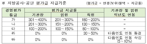 경영평가 결과에 따라 이들 지방공기업 임직원의 평가급이 차등 지급된다. 최상위인 ‘가’ 등급을 받으면 직원은 180∼200%, 임원은 201∼300%, 기관장은 301∼400%의 평가급이 지급된다. 반면 최하위인 ‘마’ 등급을 받으면 임직원 모두가 평가급을 전혀 받지 못하며 기관장 및 임원의 다음연도 연봉은 5∼10% 삭감된다.