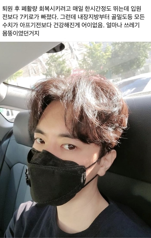 박태준은 7일 자신의 페이스북에 “퇴원 후 폐활량 회복시키려고 매일 한 시간 정도 뛰는데 입원 전보다 7㎏이 빠졌다”며 “그런데 내장지방부터 골밀도 등 모든 수치가 아프기 전보다 건강해진 게 어이없다. 얼마나 쓰레기 몸뚱이였던 거지”라는 글을 게재했다.