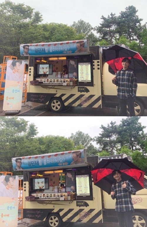 두 장의 사진 속에서 김민재는 우산을 들고 커피차 앞에서 환하게 미소를 짓고 있다. 멀리서 봐도 뚜렷한 이목구비로 보는 이들의 시선을 사로잡는다.