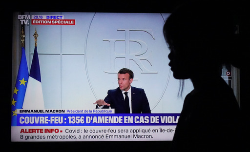 14일(현지시간) 에마뉘엘 마크롱 프랑스 대통령이 코로나19 대응과 관련해 TV 인터뷰를 하는 모습이 파리 시내의 한 전광판에 중계되고 있다. 유럽에서 코로나19 재확산이 가장 심각한 나라 중 하나인 프랑스는 오는 17일부터 국가보건 비상사태를 다시 선포하기로 의결, 9개 지역에서 최소 4주 동안 오후 9시부터 오전 6시까지 통행금지 조치를 시행하고 이를 어기면 135유로(약 18만원)의 벌금을 내야 한다.