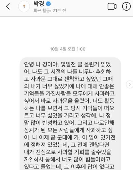 공개된 사진 속에는 박경이 A씨에게 보낸 사과의 메시지가 캡처돼있다. 사진 속 박경은 “나 이제 곧 군대에 가. 이 일이 있기 전에 정해져 있었는데, 그 전에 괜찮다면 내가 진심으로 사과할 기회를 줄 수 있을까?”라며 A씨에게 만남을 청했다.