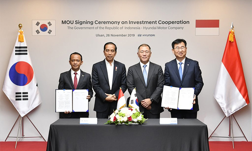현대자동차와 인도네시아 정부 관계자들이 지난해 11월 26일 현대차 인도네시아 공장 설립을 위한 투자협약서에 서명한 후 기념촬영하고 있다. 사진 왼쪽부터 바흐릴 라하달리아 인도네시아 투자조정청장, 조코 위도도 인도네시아 대통령, 정의선 현대자동차그룹 수석부회장, 이원희 현대차 사장. 현대차 제공