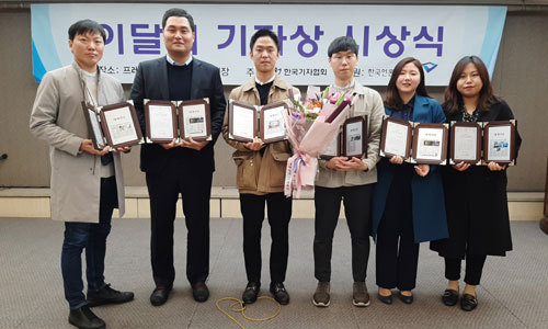한국기자협회 주관의 제361회 이달의 기자상 ‘기획보도 신문·통신부문’에서 ‘언택트 시대, 소외된 노인들’ 기사로 수상한 세계일보 김선영(왼쪽부터)·조병욱·이종민·이강진·박지원·유지혜 기자가 29일 오전 서울 중구 프레스센터 시상식에서 기념촬영을 하고 있다.