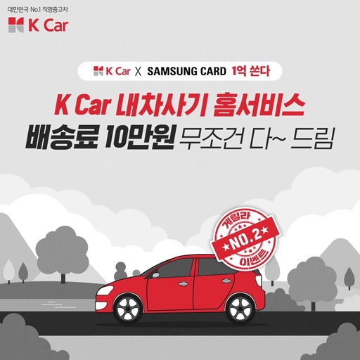 국내 최대 직영중고차 기업 K Car(케이카)가 비대면 구매 시스템 ‘내차사기 홈서비스’ 론칭 5주년을 기념해 삼성카드와 함께 하는 ‘1억 쏜다 이벤트’ 중 두번째 게릴라 이벤트 ‘배송비 쏜다!’를 실시한다고 30일 밝혔다.