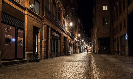 신종 코로나바이러스 감염증(코로나19) 재확산으로 야간 통행 금지 조치를 시행 중인 프랑스 남서부 툴루즈 거리가 지난달 24일(현지시간) 텅 비어 있다. 툴루즈=AFP연합뉴스