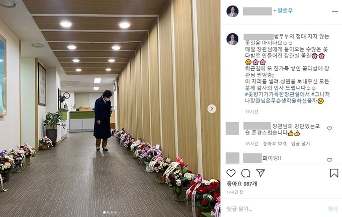 지난 18일 한 인스타그램 계정에 이 같은 내용의 글과 함께 법무부 청사 내부로 보이는 건물에 놓인 꽃바구니를 보는 추미애 법무부 장관의 사진 여러 장이 올라왔다.