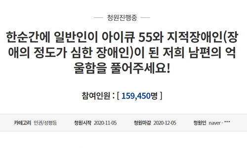 이 사건은 지난 5일 B씨의 아내가 ‘한순간에 일반인이 아이큐(IQ) 55와 지적장애인(장애의 정도가 심한 장애인)이 된 저희 남편의 억울함을 풀어주세요!’라는 제목의 청와대 국민청원을 올리면서 세간에 알려졌다. B씨의 아내는 청원글에서 “야구선수 출신에 덩치가 크고 힘이 좋은 가해자의 단 한 번의 가격으로 남편은 시멘트 바닥에 쓰러지며 머리를 부딪혔다”며 “남편은 빠른 수술로 운 좋게 살아났지만, IQ 55로 지적장애 판정을 받아 직장을 잃었고, 가정은 파탄의 지경에 이르렀다”고 호소했다. 그는 “가해자로부터 진정한 사과나 병원비조차 받아보지 못했다”고도 덧붙였다.