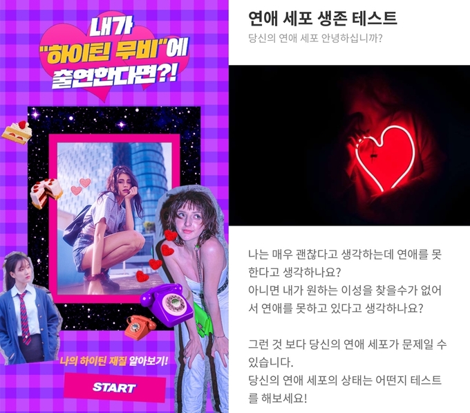 하이틴 테스트는 롯데 쇼핑에서 제공, 자신이 하이틴 영화에 출연한다면 어떤 캐릭터를 맡을지 알려주는 심리테스트다. 해당 테스트에서 ‘가방 속 데일리 아이템’, ‘새로 오신 교생 선생님이 맡을 과목‘, ‘내가 축제에서 맡을 역할‘ 등의 질문에 답을 하면 하이틴 무비 속에서 어울리는 역할을 추천해준다.