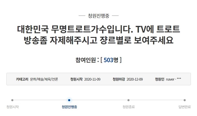 자신을 무명 트로트 가수라고 밝힌 청원자는 “처음에는 트로트가 활성화되어 좋았지만, 그 뒤 무명가수 수십만 명이 다 죽은 것 같다”고 말했다.