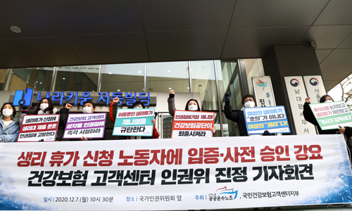 7일 민주노총 공공운수노조와 인권운동네트워크바람은 서울 중구 국가인권위원회 앞에서 기자회견을 열고 “건강보험 고객센터에서 발생한 생리 휴가권 침해와 인격모독, 성차별을 바로잡아 달라”고 요구했다.