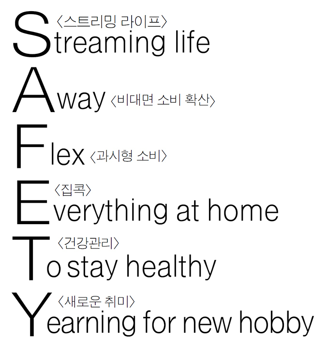 한국방송광고진흥공사(코바코)가 올해 소비 트렌드 결산 키워드로 ‘SAFETY’를 선정했다. 이는 ‘스트리밍 라이프(Streaming Life)’, ‘비대면 소비 확산(Away)’, ‘과시형 소비(Flex)’, ‘홈라이프, 집콕(Everything at home)’, ‘건강관리(To stay healthy)’, ‘새로운 취미(Yearning for new hobby)’의 앞글자에서 따온 것이다.
