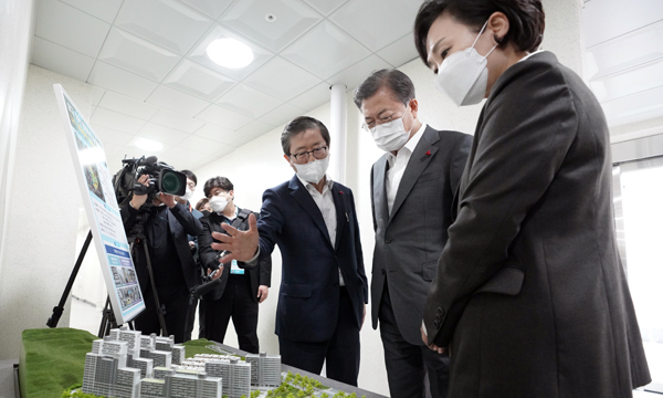 - 문 대통령 : 이게 점점 주거도 발전해 가지고 아이도 생기고, 아이가 자라기도 하고, 아이가 늘기도 할뿐만 아니라 그러면 가족이 많아지죠. 뿐만 아니라 생활수준도 그러면서 이렇게 재산이 형성되기도 하고 하면 보다 좀 높은 수준의 그 주거를 원할 수 있기 때문에 이 주거와 함께 일종의 사다리랄까, 이런 기본적인 주택에서 조금 더 안락하고 살기 좋은 그런 중형 아파트로 옮겨갈 수 있는, 굳이 자기가 자기 집을 꼭 소유하지 않더라도 이런 임대주택으로도 충분히 좋은 주택으로도 발전해 갈 수 있는, 그 어떤 주거 사다리랄까 그런 것을 잘 만들어야 될 것 같습니다.