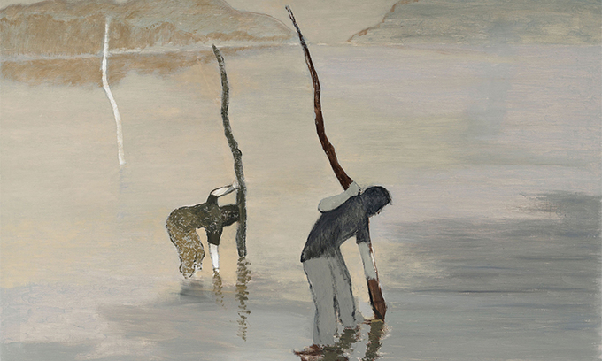 옅은 안개가 낀 것 같은 강이 있다. 그 안개 사이에 낮은 산자락이 이어지는 모양이 보인다. 고요함이 전해오는 풍경을 배경으로 그 앞에는 사람이 있다. 두 사람의 손에는 키를 훌쩍 넘는 나뭇가지가 있다. 일부는 강에 잠겨 있고 나머지는 하늘을 향한다. 사람들은 그 나무를 꼭 쥐고 몸을 반쯤 숙인 상태다. 나무에 몸을 기대고 의지하고 힘을 주어 일어나려는 듯 보인다. 유채물감으로 그렸지만 담백하게 붓질해낸 화면이 인상적이다. 물감의 붓질과 겹침은 공기층마저 묘사하는 듯 보인다. 단순하게 그렸지만, 사진에서의 분위기가 그대로 전해진다.
