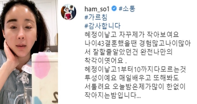 이후 올린 글을 통해서는 “혜정이 낳고 자꾸 제가 작아보인다. 나이 43 결혼했을 땐 경험 많고 나이 많아서 잘할 줄 알았던 건 완전 나만의 착각이었다”며 “혜정이 낳고 1부터 10까지 다 모르는 것 투성이”라고 털어놓으며 육아에 대한 고충을 털어놓았다.