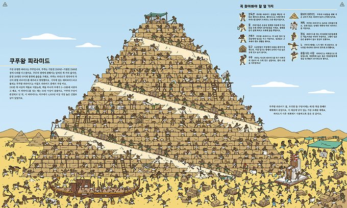 우선 책을 펼치면 역사와 문화를 한눈에 볼 수 있는 거대한 그림(56㎝×34㎝)이 독자를 맞는다. 그림에는 수십명의 이집트인들이 각자의 일을 하고 있다. 그림 왼쪽 상단에는 해당 건축물 등에 대한 설명이 적혀있다. 오른쪽 상단에는 ‘꼭 찾아야 할 열 가지’가 위치해 독자에게 임무가 부여된다. 일종의 숨은그림찾기로, 해당 문화에 중요한 역할을 하는 사람이나 건축물 등을 거대한 그림 안에서 찾는 임무다.