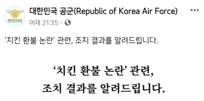 공군은 전날 공식 SNS 계정에 "'치킨 환불 논란' 관련 조치 결과를 알려드린다"며 "12일 저녁 해당 부대장과 업주분은 직접 만나 대화를 나누고 문제를 원만하게 해결했다"고 공식 입장을 밝혔다.