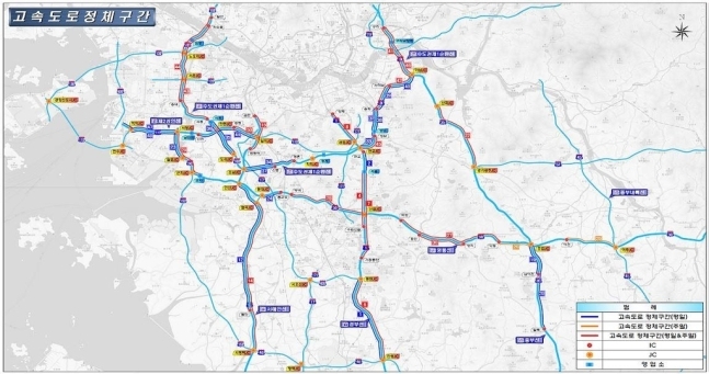정체 구간 재선정 결과 노선별 최장 정체 노선은 수도권 1순환선(96.2㎞)으로 나타났다. 이어 경부선(74.8㎞), 서해안선(51.1㎞), 영동선(42.1㎞) 순이었다. 권역별로 보면 수도권이 232.6㎞로 전체의 약 74%를 차지했고 이어 대전·충남(37.9㎞), 강원(19.9㎞)이 그 뒤를 이었다.