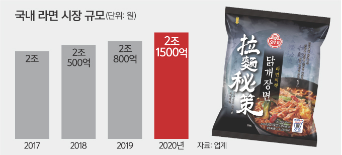 국내 라면시장은 수년째 2조원 초반대로 정체 상태다. 지난해에는 코로나19로 인한 가공식품 수요 증가로 라면매출은 전년보다 다소 성장한 2조1500억원으로 추정된다. 집에서 간편하게 식사를 대신할 수 있는 식품으로 라면이 주목받으면서 고급화 라면 시장도 확대될 것으로 보인다.
