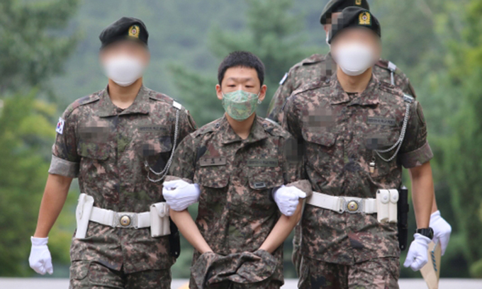 텔레그램에서 성 착취물을 제작·유포한 혐의 등으로 구속기소된 '박사방' 공동운영자 이원호가 지난해 8월7일 서울 관악구 수도방위사령부 보통군사법원에서 열린 1차 공판에 출석하고 있다.뉴스1