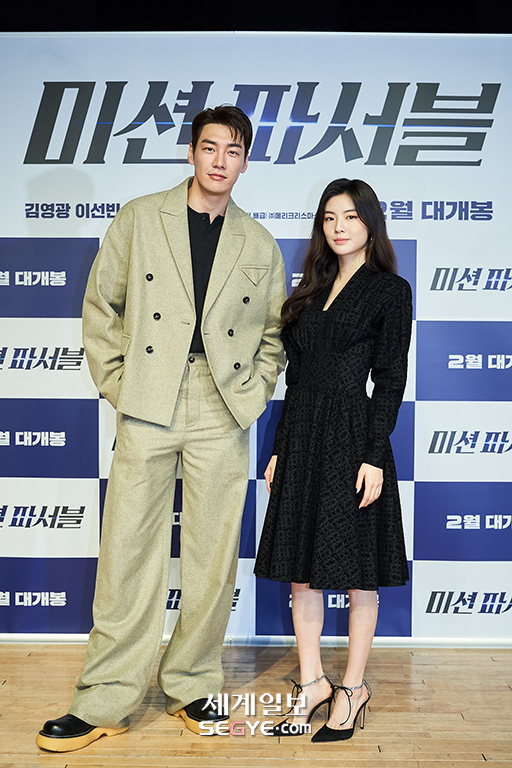 배우 김영광(사진 왼쪽)과 이선빈이 1일 온라인으로 진행된 영화 '미션 파서블' 제작보고회에 참석해 포즈를 취하고 있다.