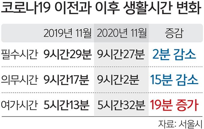 서울시는 코로나19 전후인 2019년 11월과 지난해 11월 서울시민의 하루 생활시간을 비교·분석한 결과 필수시간과 의무시간이 각각 2분, 15분 감소했고 여가시간은 19분 증가했다고 4일 전했다. 이번 조사는 만 18∼69세 서울시민 1000명 대상 온라인 설문조사 형식으로 진행했다.