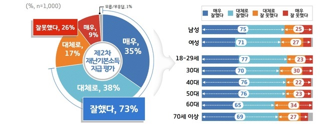 경기도 2차 재난기본소득 지급에 대해 도민 10명 중 7명이 긍정적으로 평가한다는 조사 결과가 나왔다.