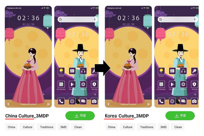 앞서 샤오미는 최근 국내 한 온라인 커뮤니티에 스마트폰 배경 화면 스토어에 한복을 입은 남녀 이미지에 ‘중국 문화’(China Culture)라는 글과 함께 설명에는 ‘추석 전통 한복’(chuseok traditional hanbok)이라고 적었다.